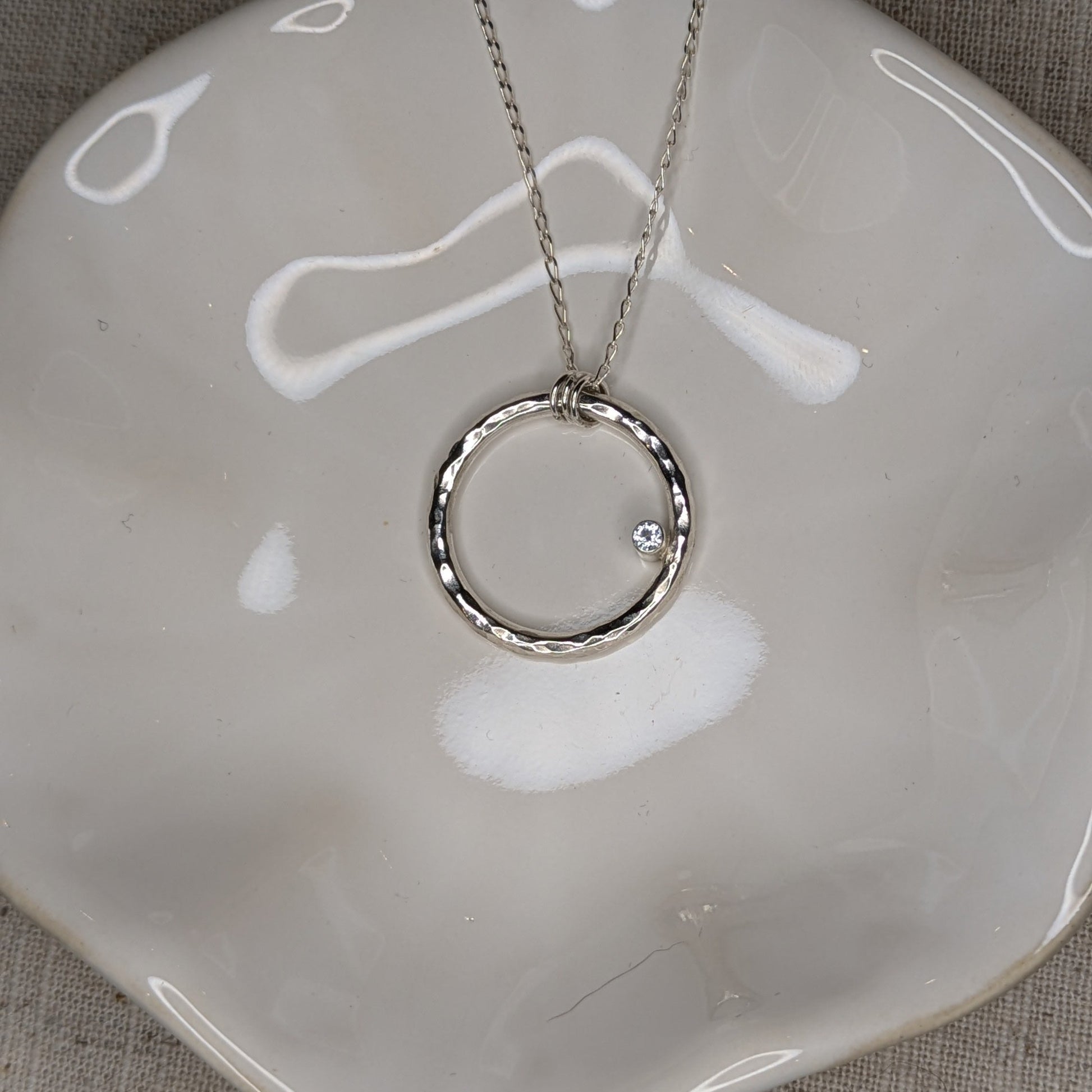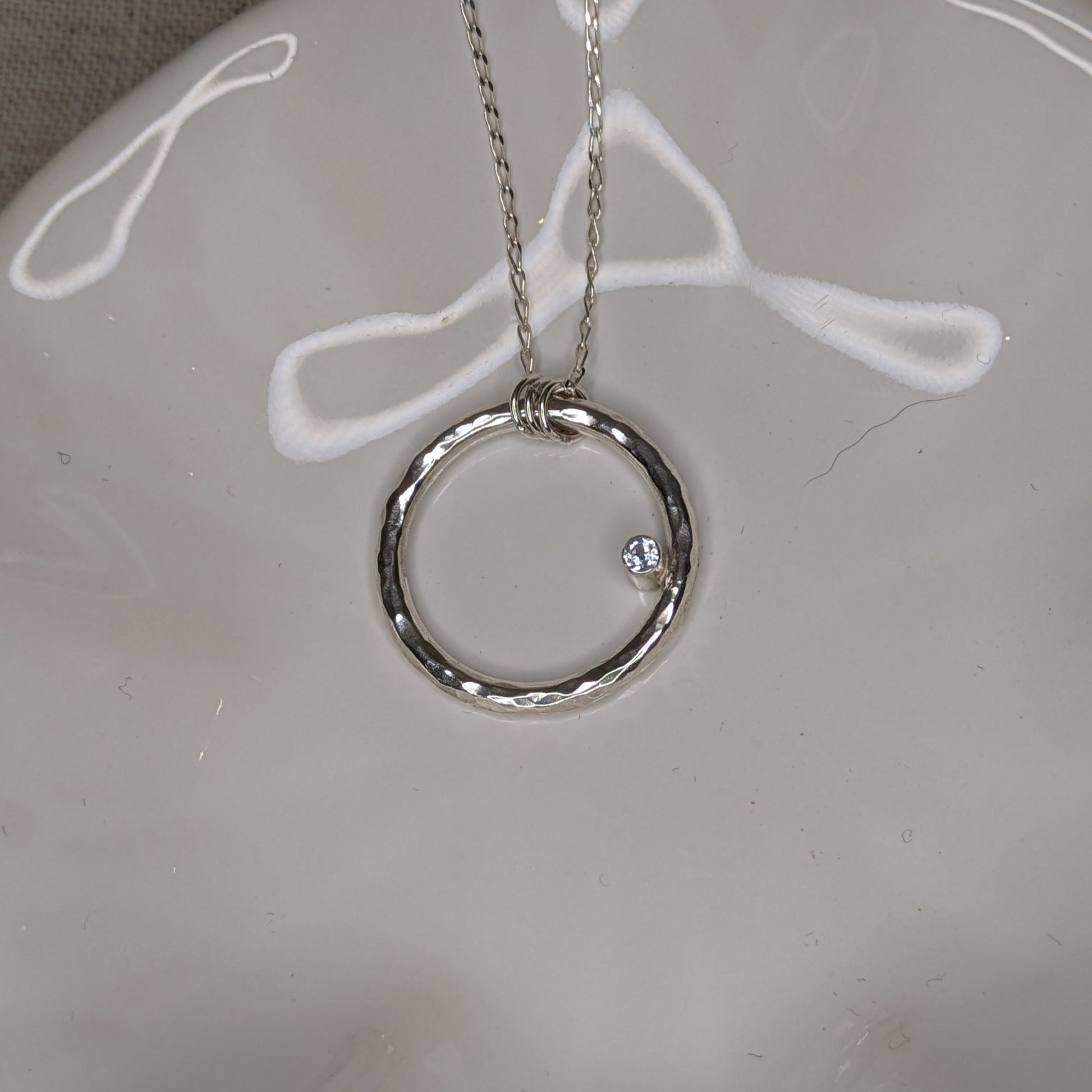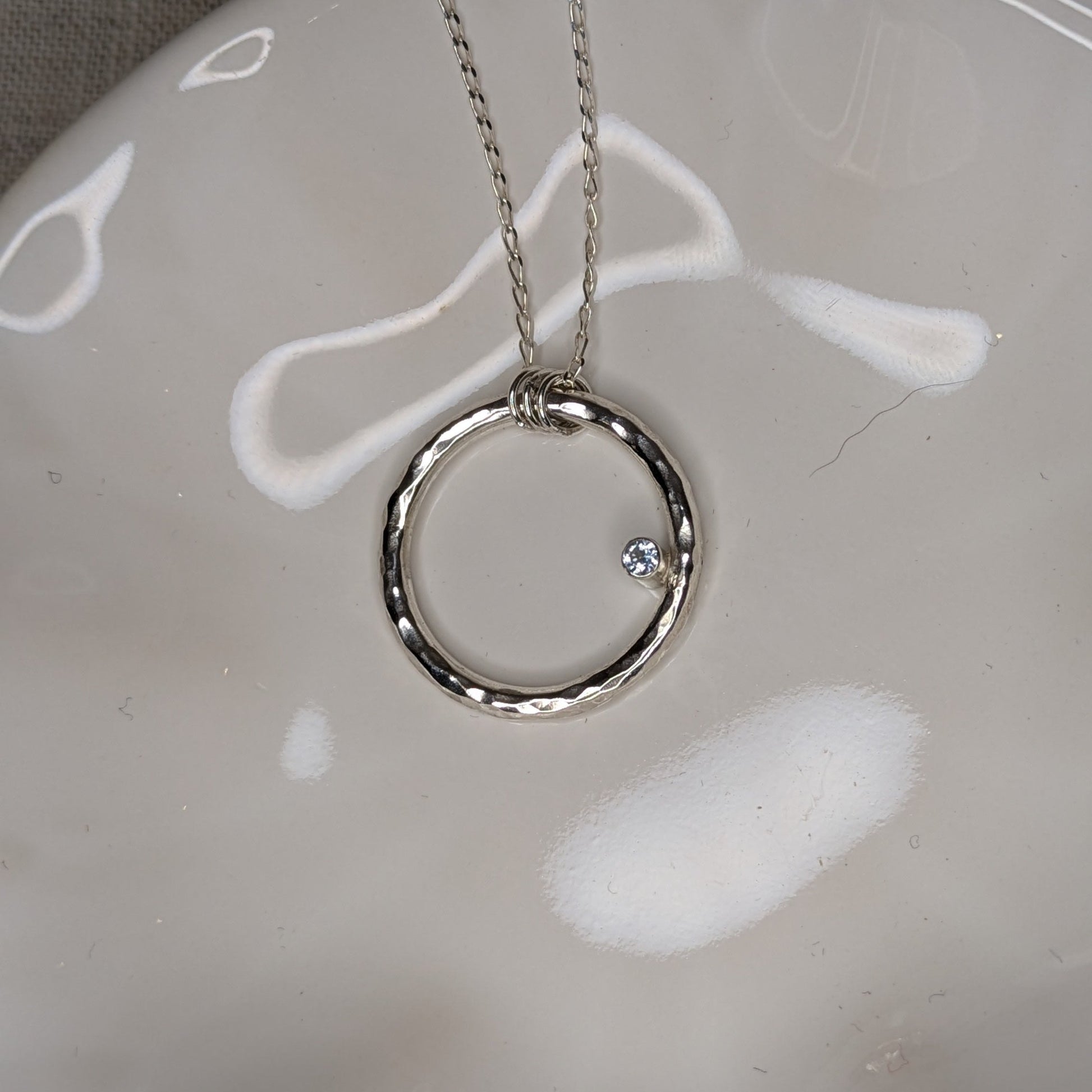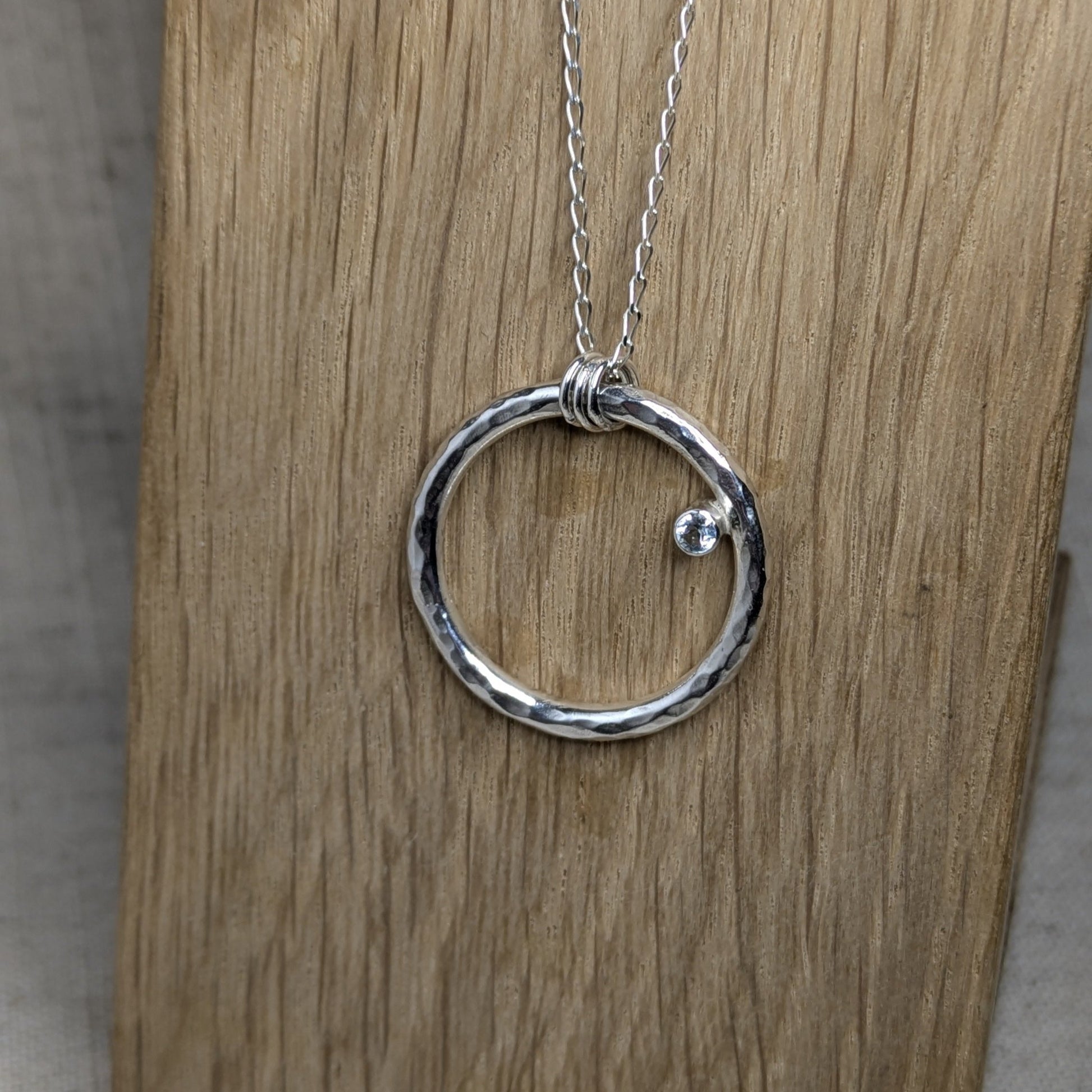 Part of the hammered collection this chunky circle pendant has a 2.5mm tube set Aquamarine set on a 20mm round sterling silver circle. The chain hangs through three jump rings to allow the pendant to turn so the angle of the gemstone can move.