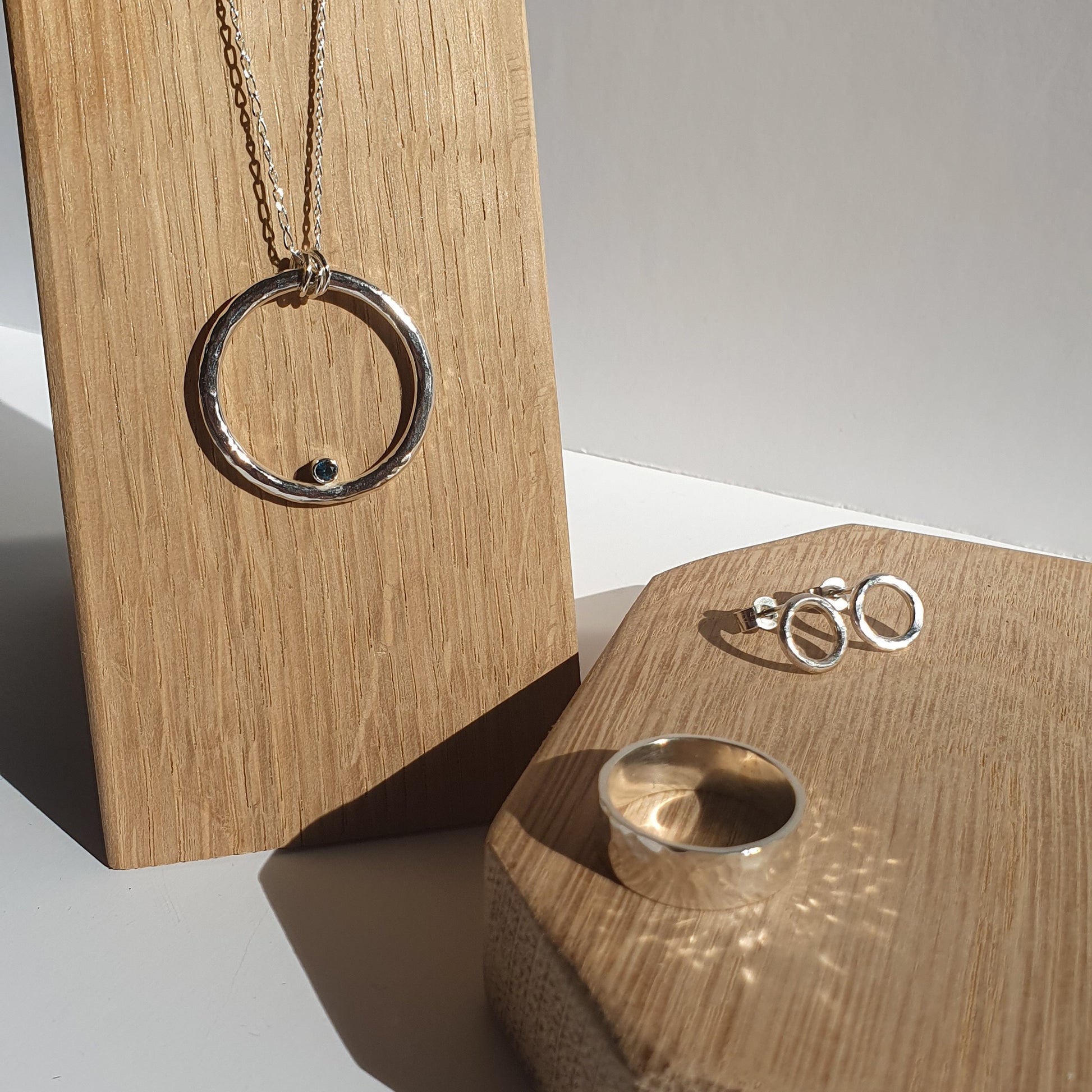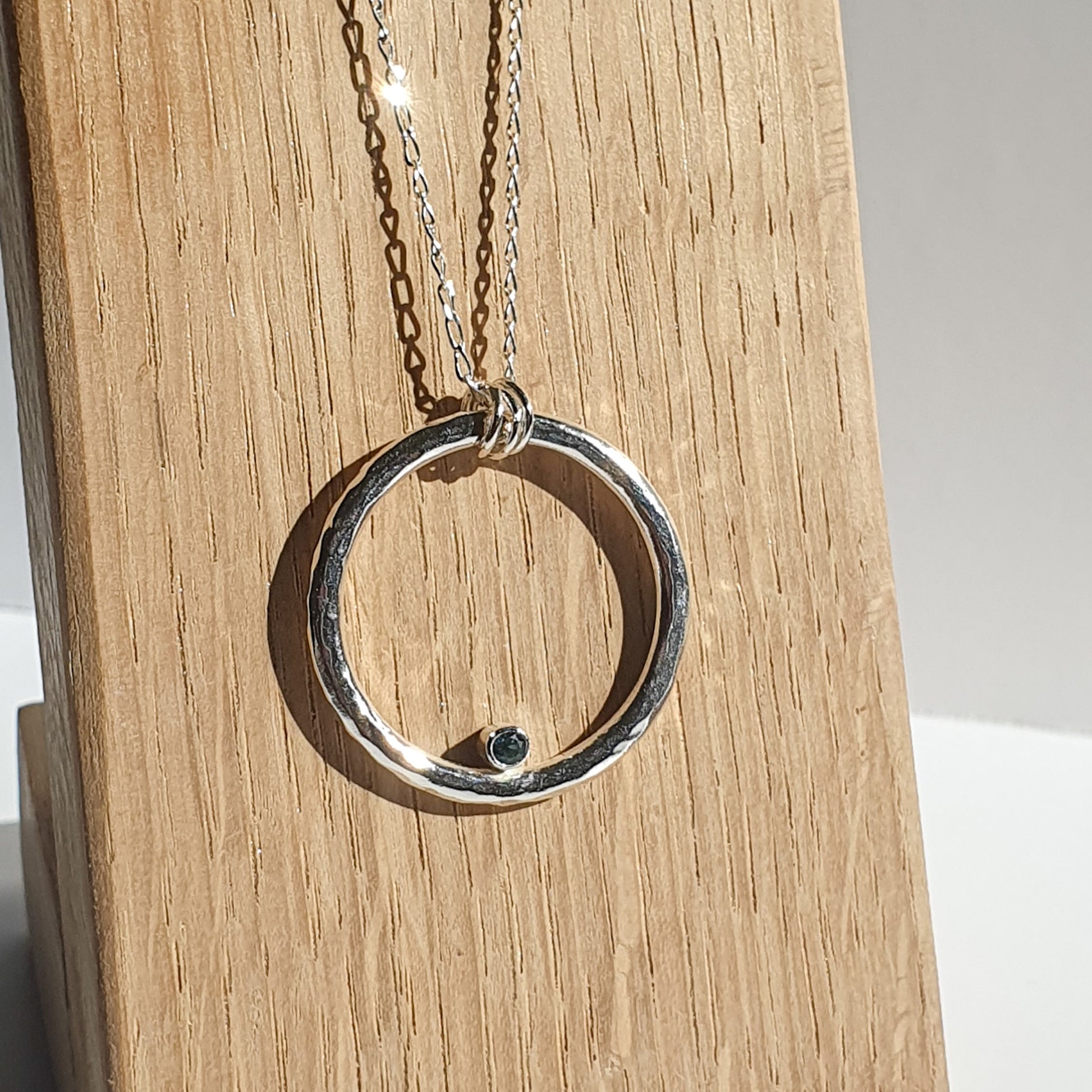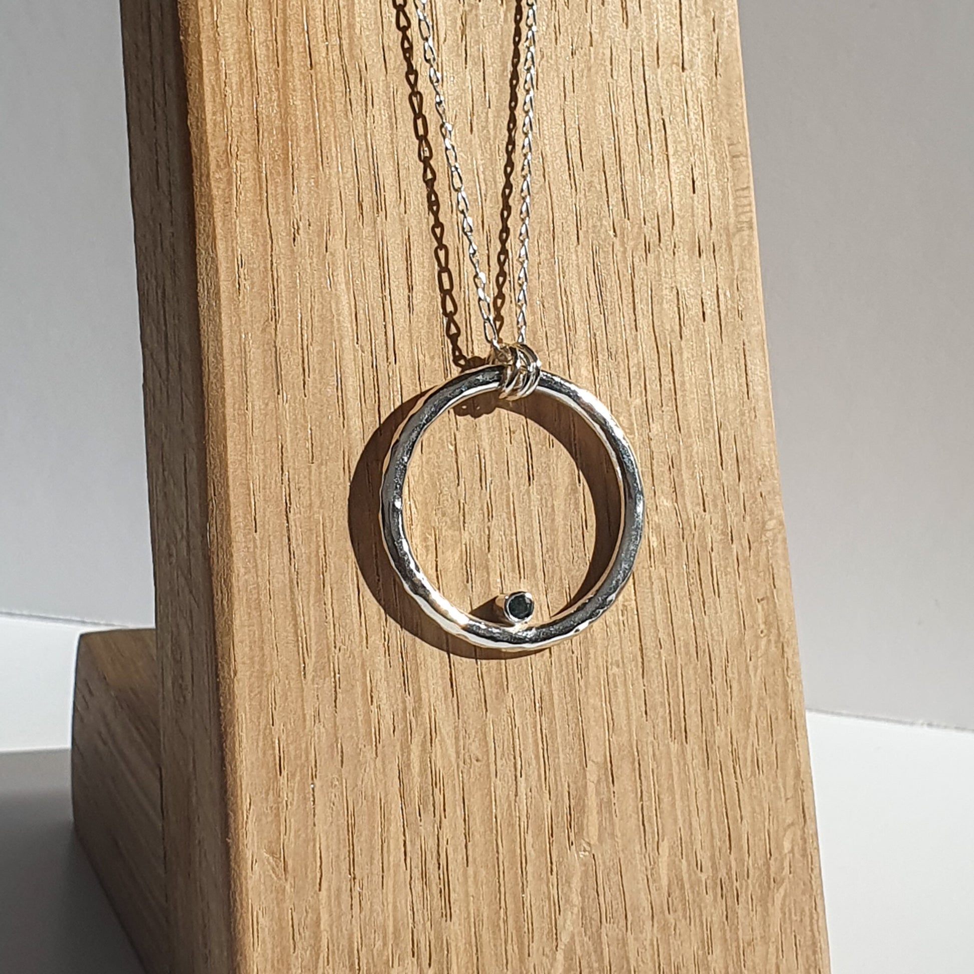 Part of the hammered collection this chunky circle pendant has a 2.5mm tube set London Blue Zirconia set on a 20mm round sterling silver circle. The chain hangs through three jump rings to allow the pendant to turn so the angle of the gemstone can move.