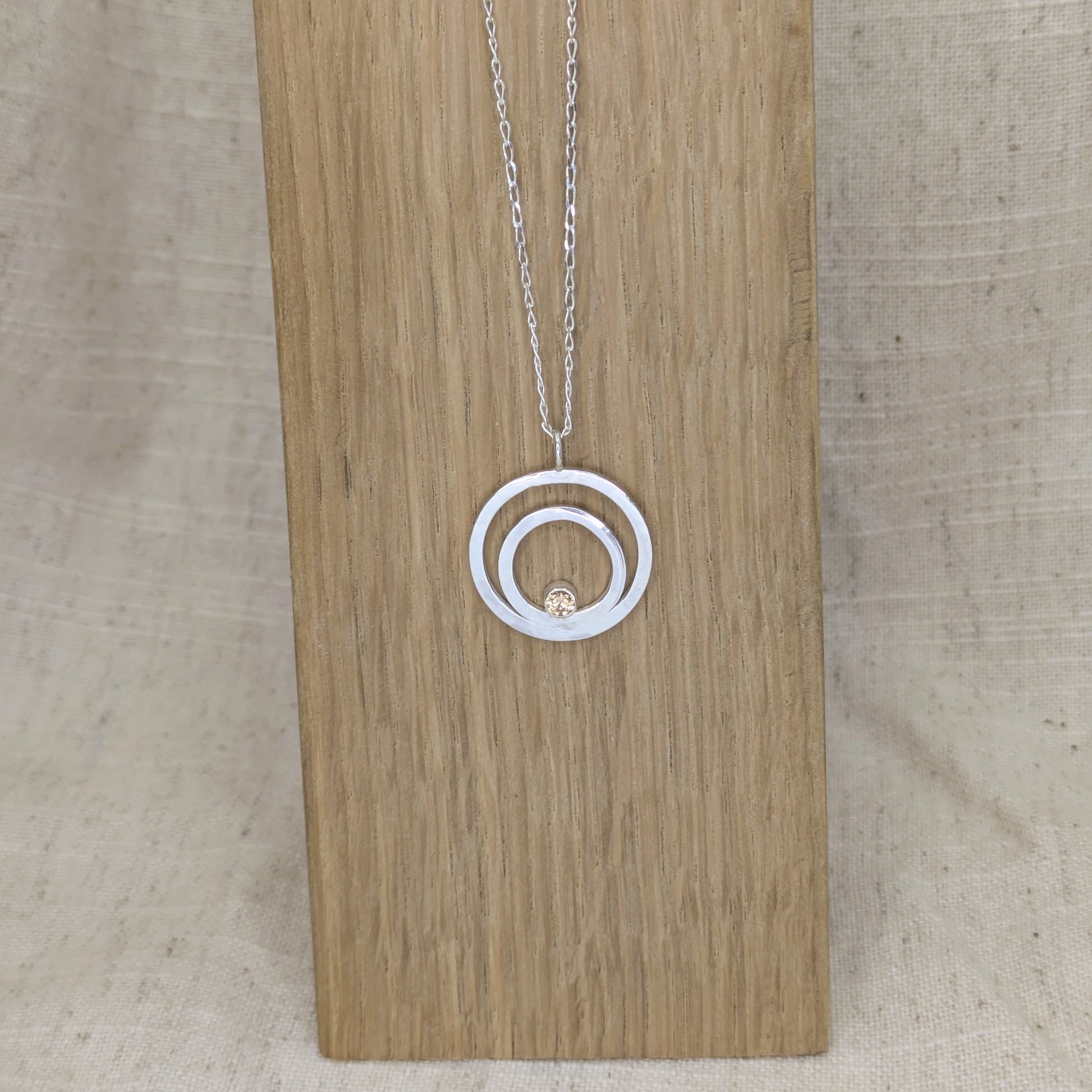Handmade double circle pendant with a 3mm tube set Champagne Cubic Zirconia. Made using recycled sterling silver.
