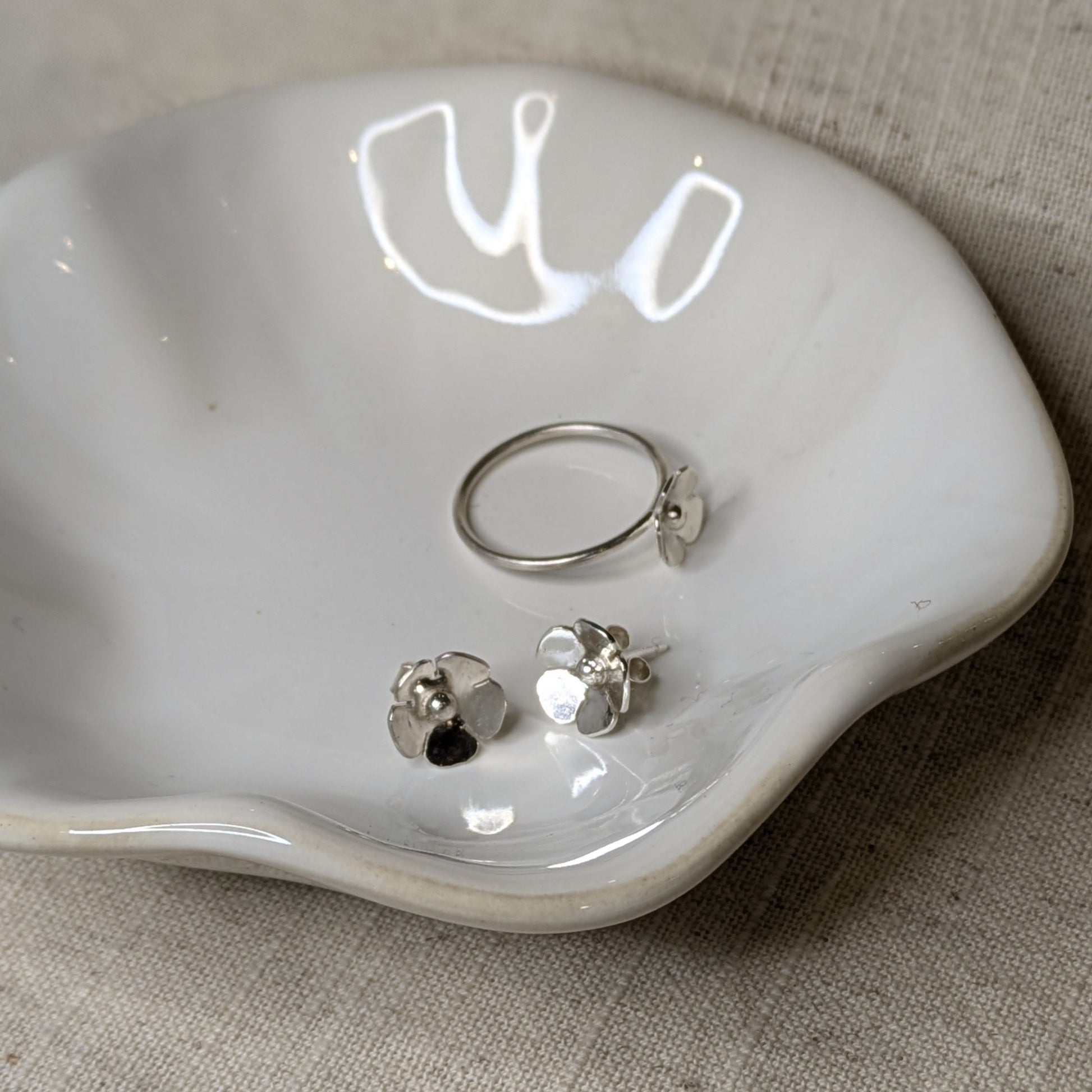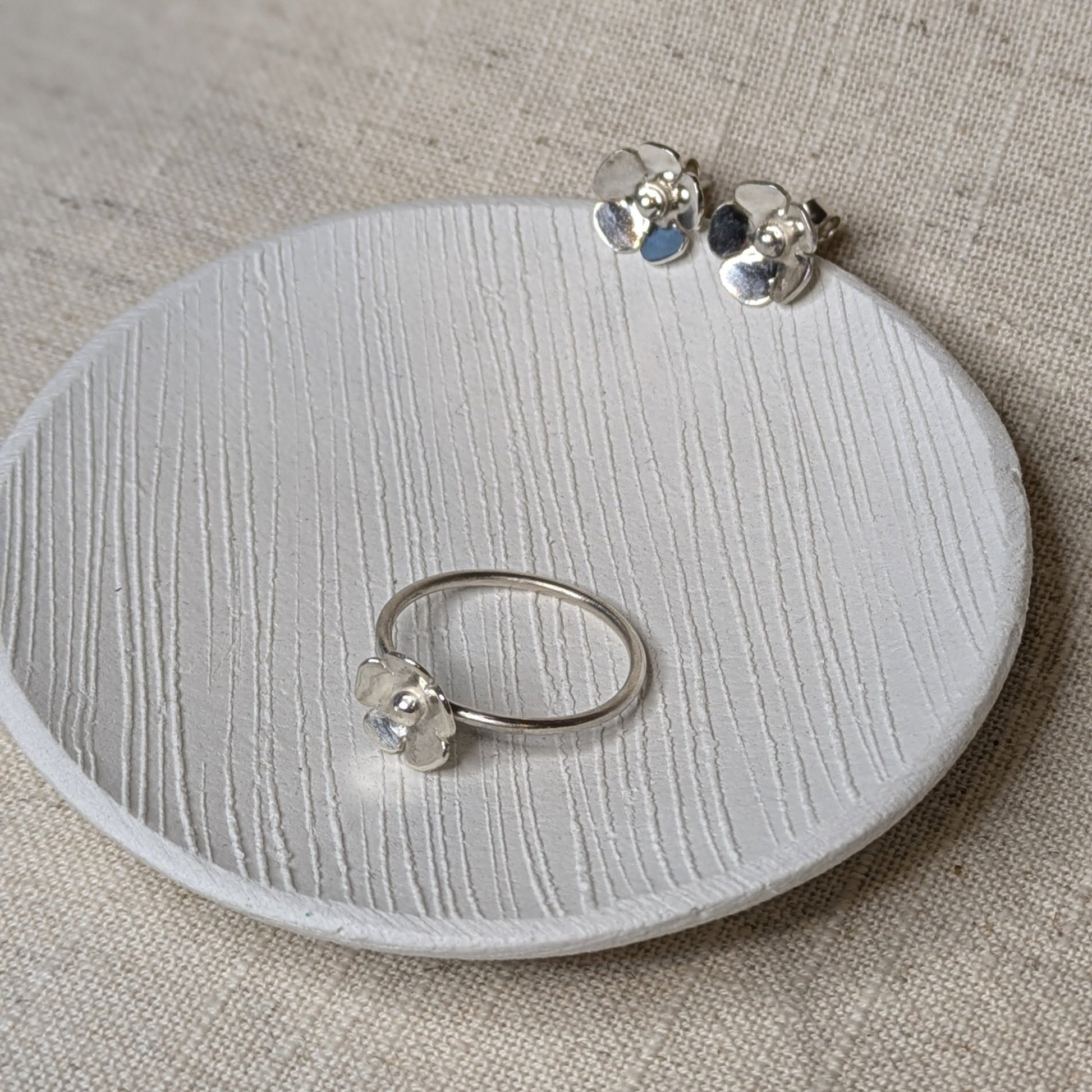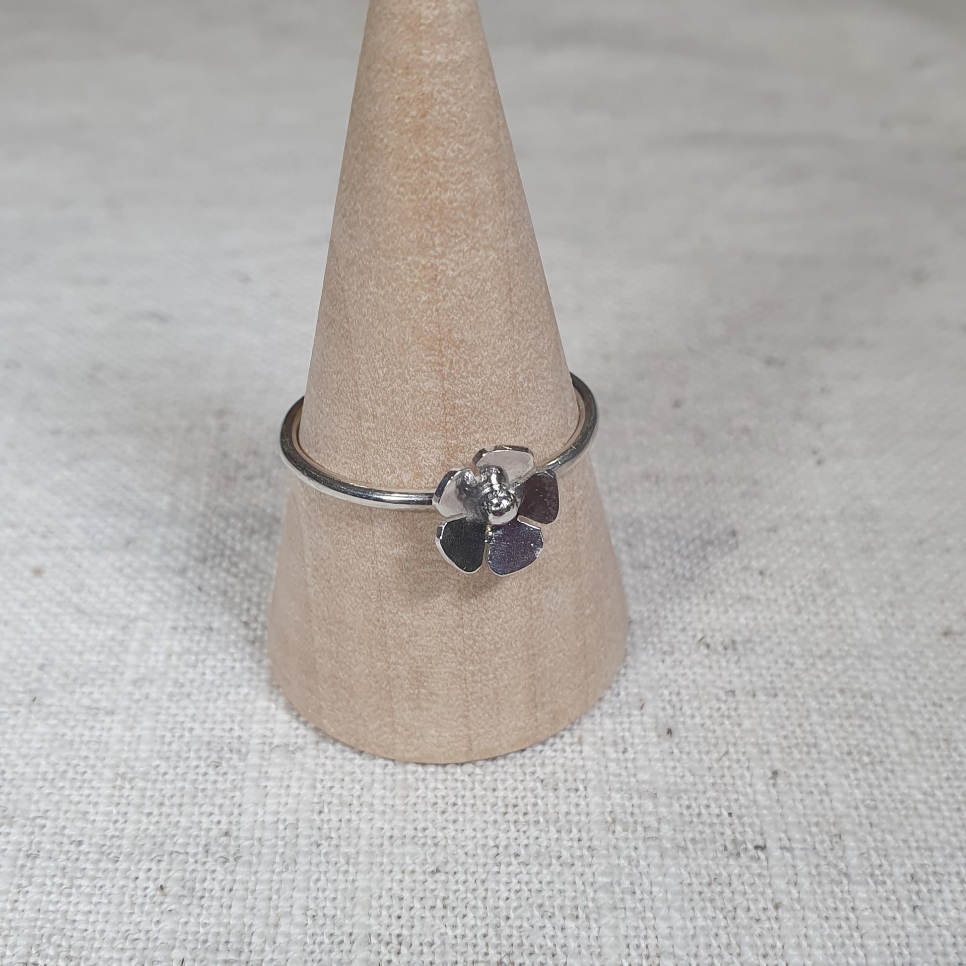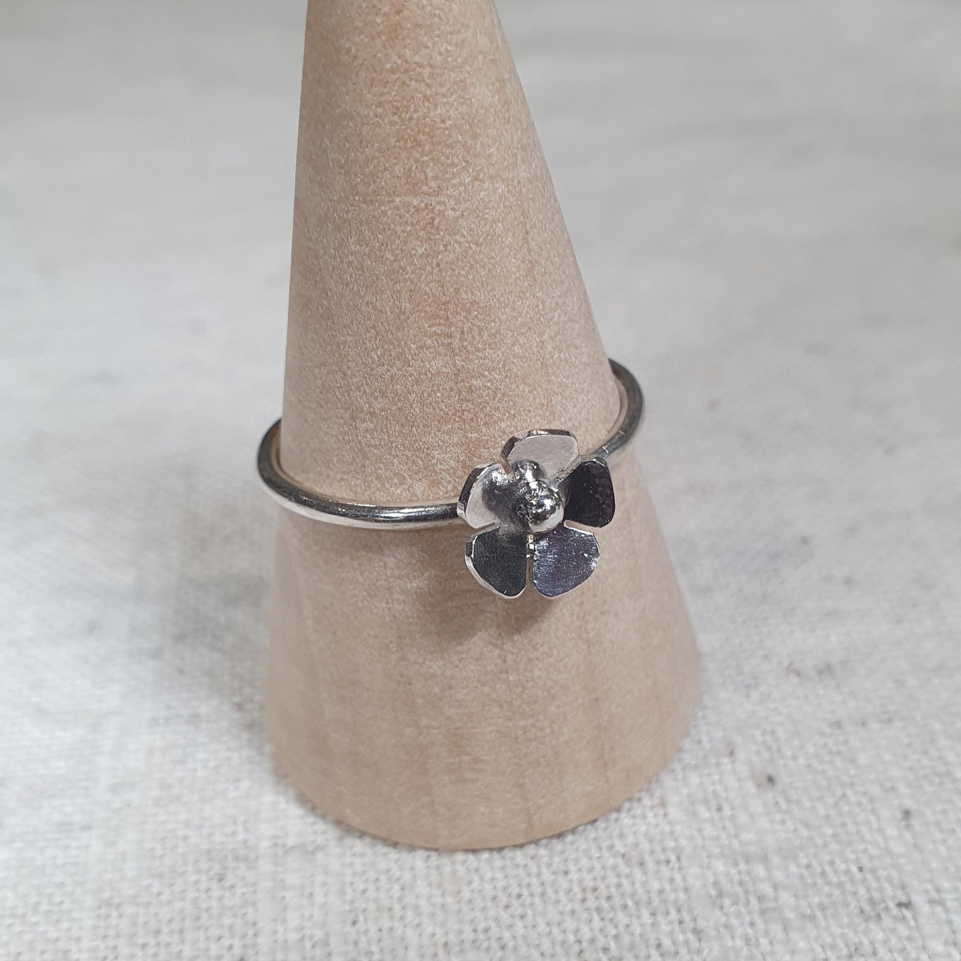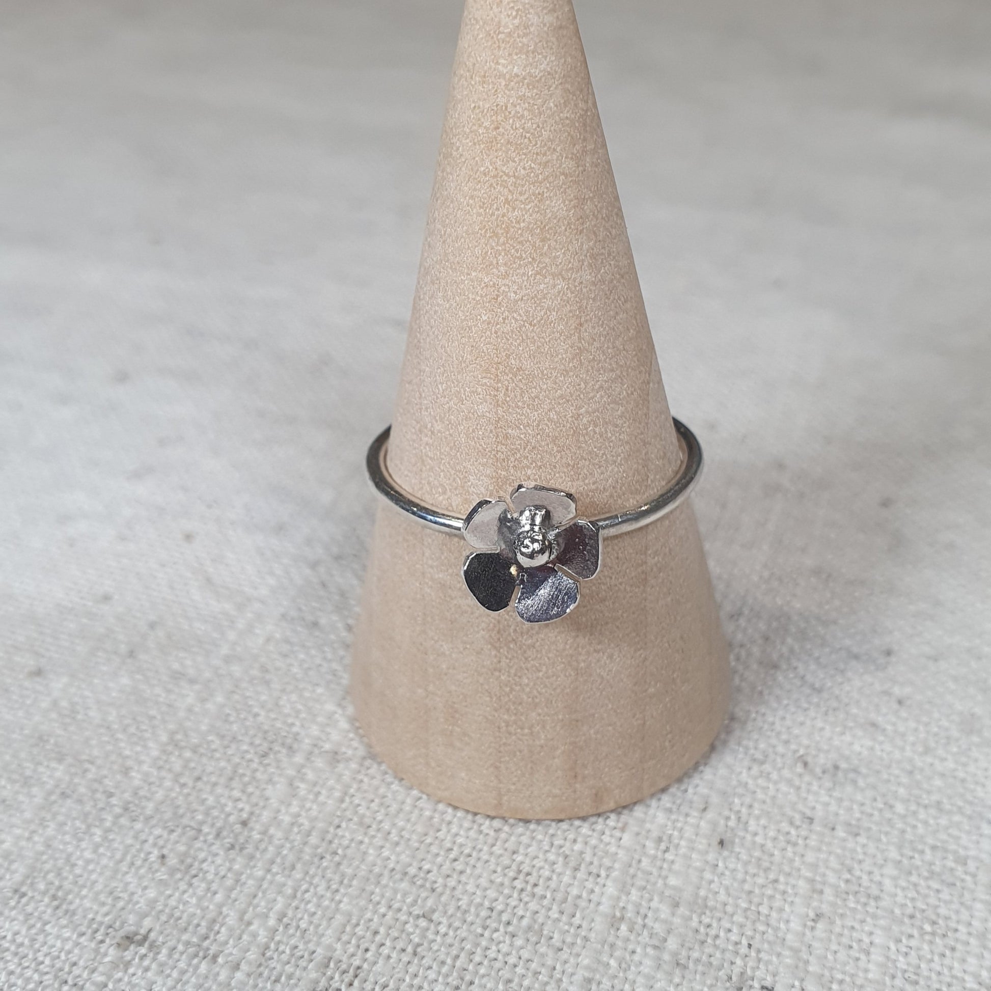 This single flower ring is a delicate design using 100% recycled sterling silver. The flower has been cut out of sterling silver sheet and domed to create the shape. The centre of the flower is then added and each petal polished to create a high shine.