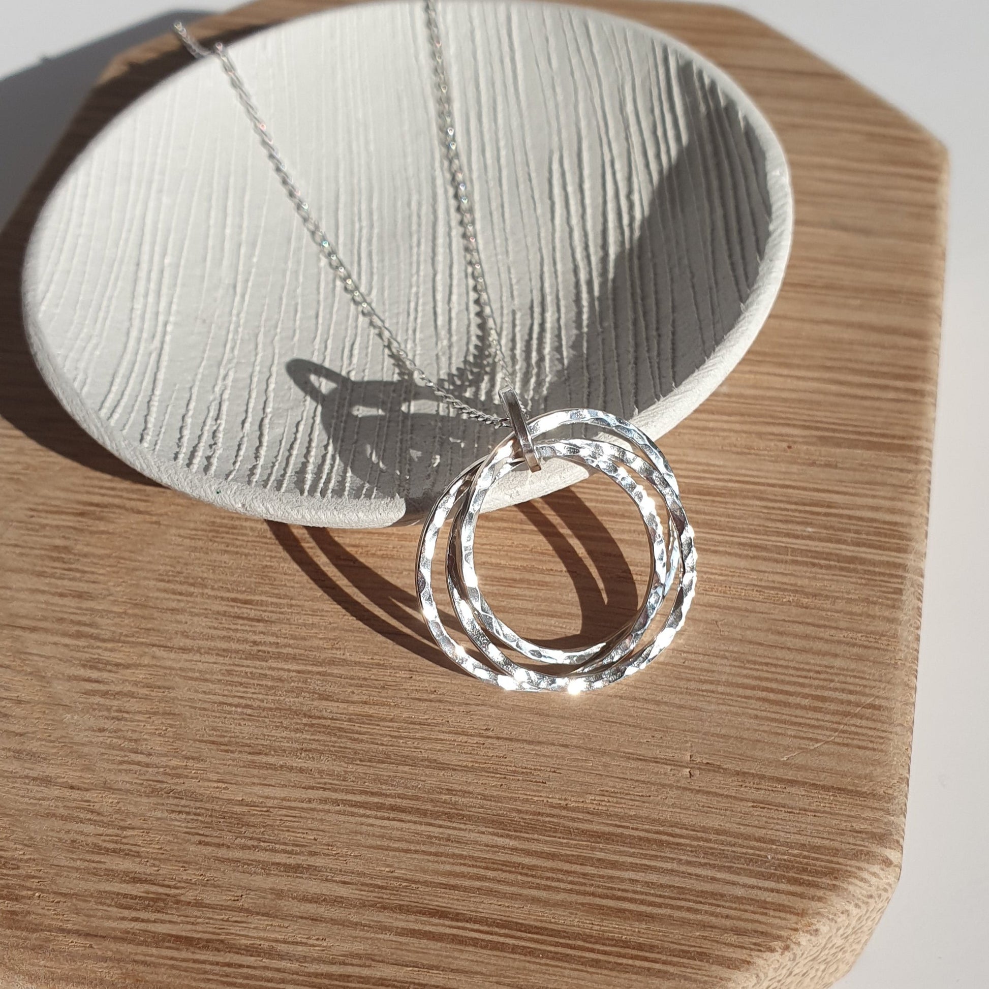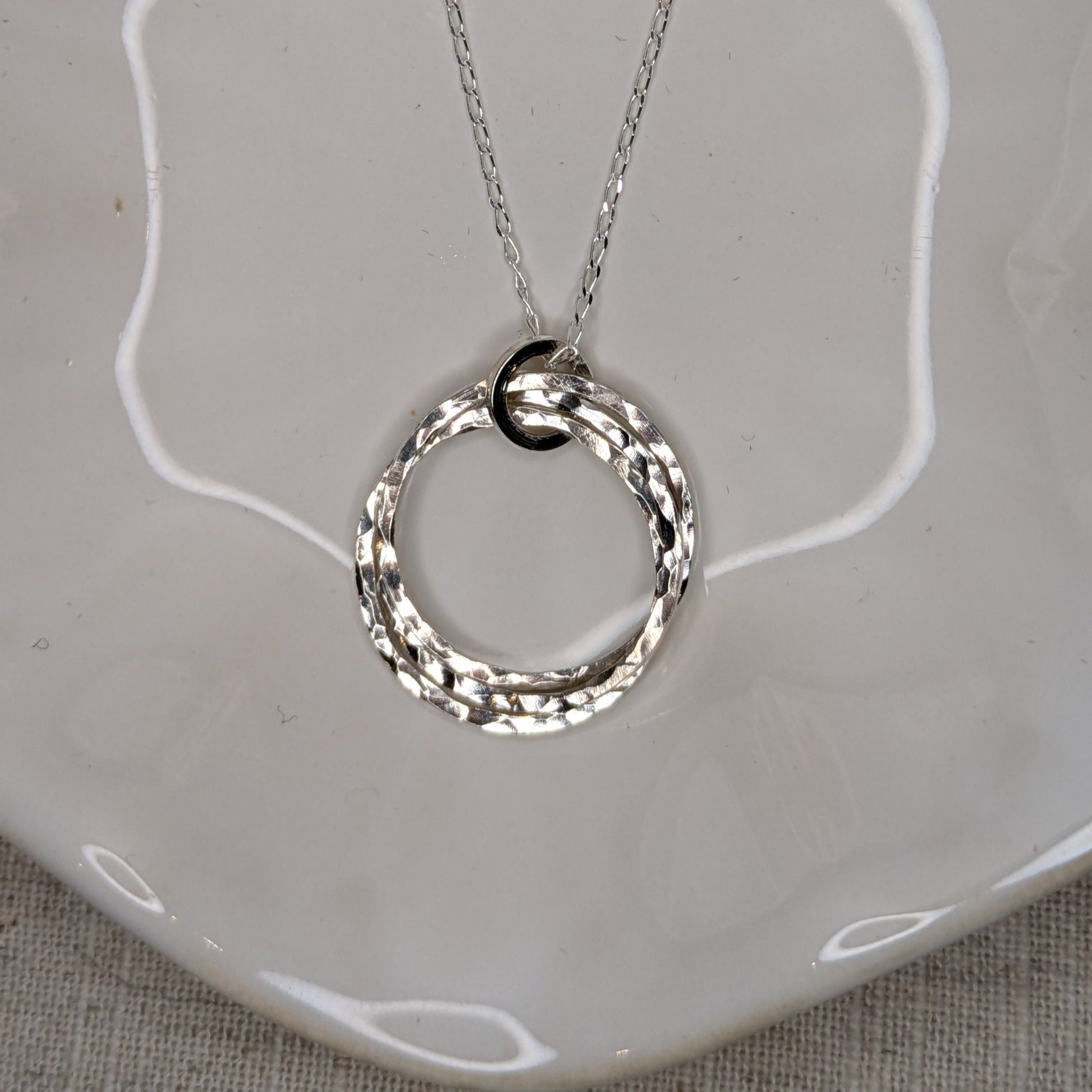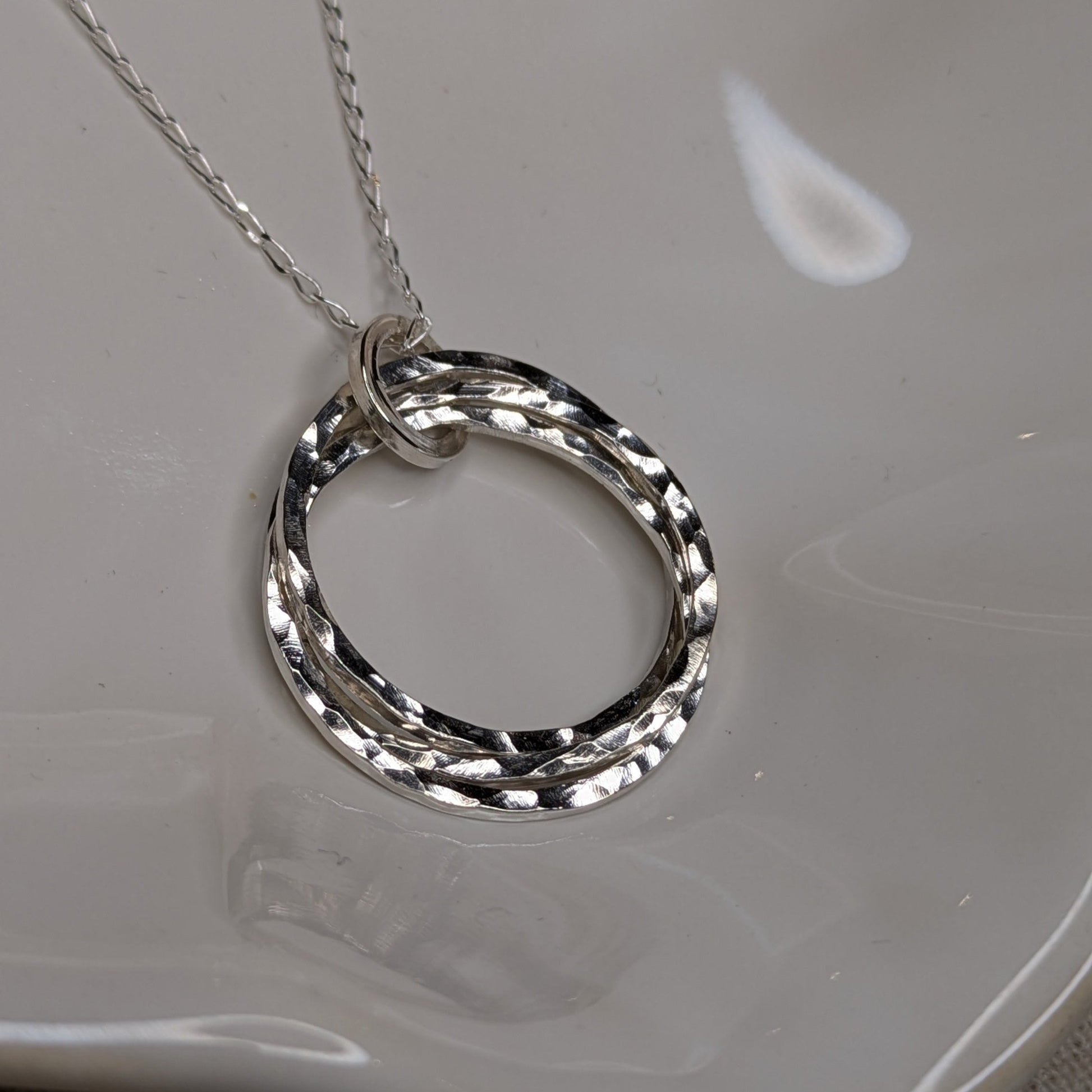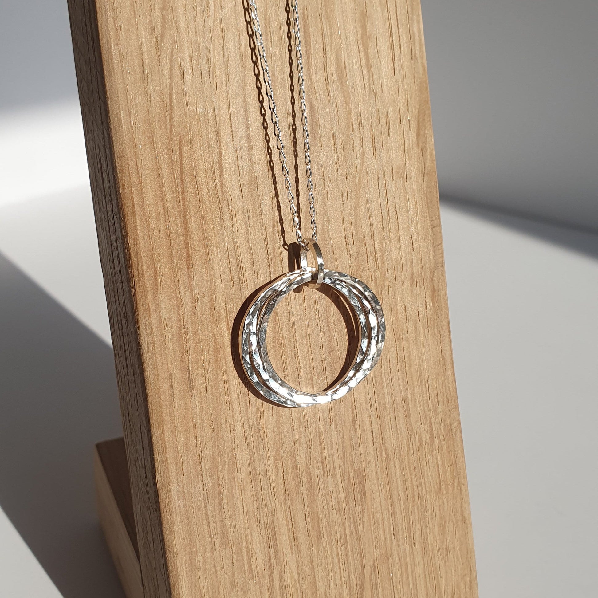 Part of the hammered collection this necklace provides a beautiful piece with three interlocking rings. The hammered effect helps to give bounce light and add texture and is finished polished