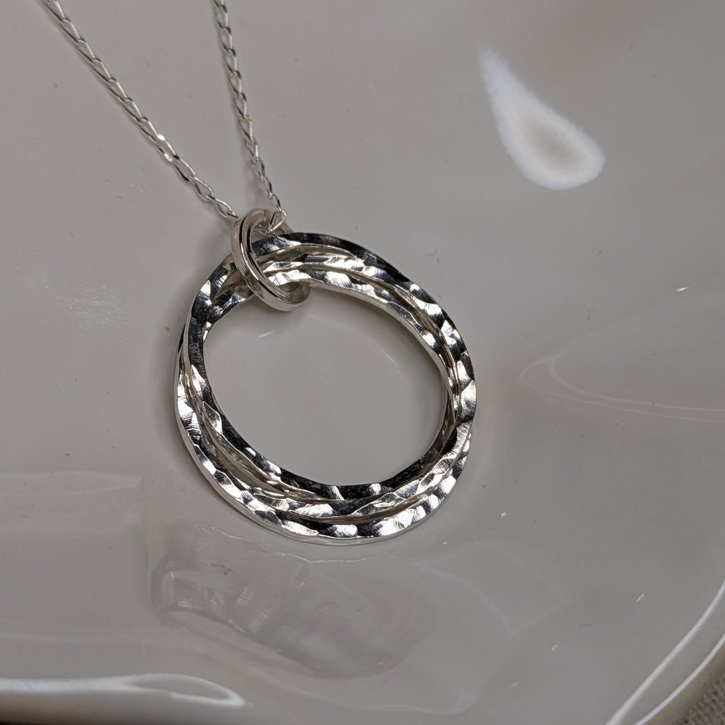 Part of the hammered collection this necklace provides a beautiful piece with three interlocking rings. The hammered effect helps to give bounce light and add texture and is finished polished.